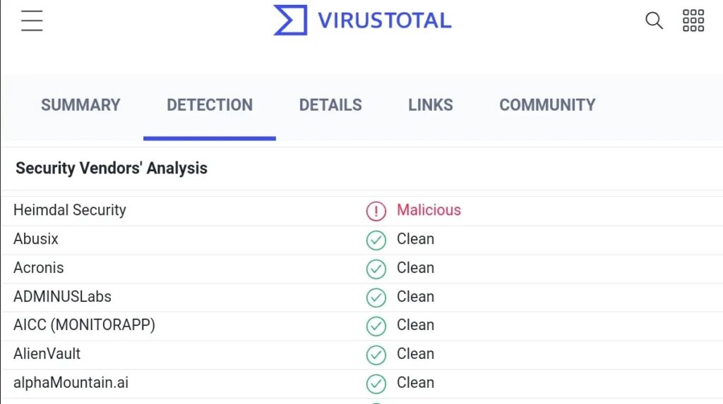 「VirusTotal」で検査した結果、「Heimdal Security」が”悪意のあるサイトである”エラーを吐きました。