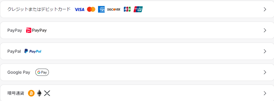 支払い方法はクレジットカード、PayPay、Paypalなどがあります。